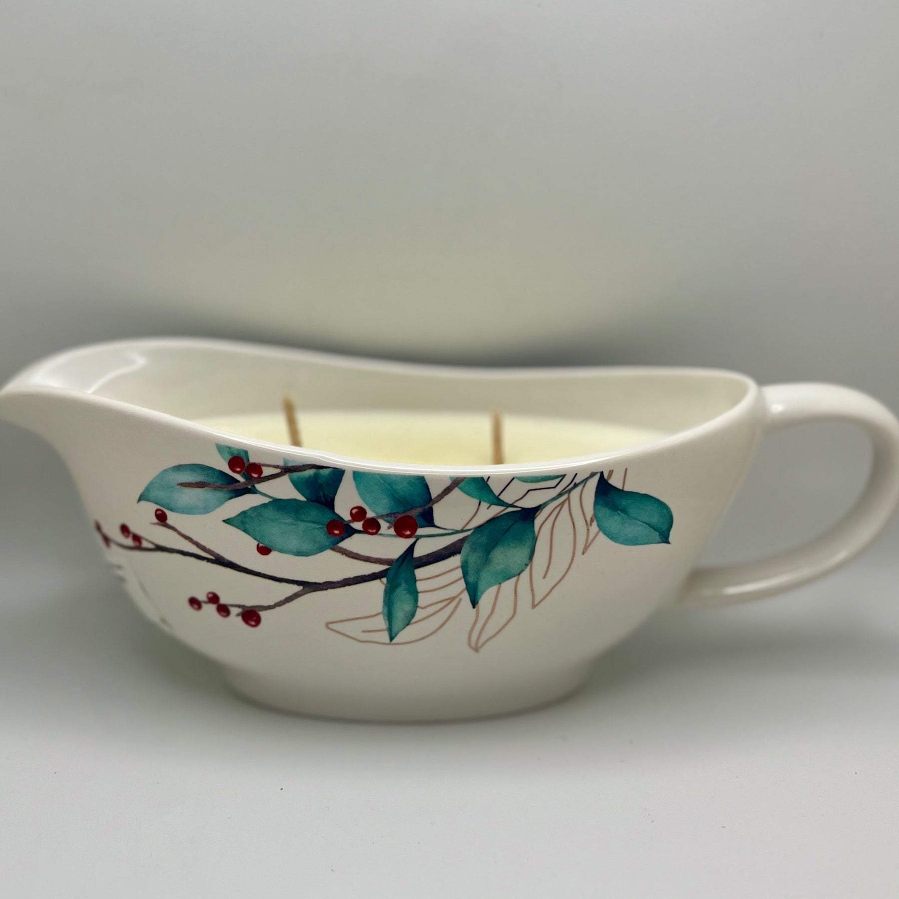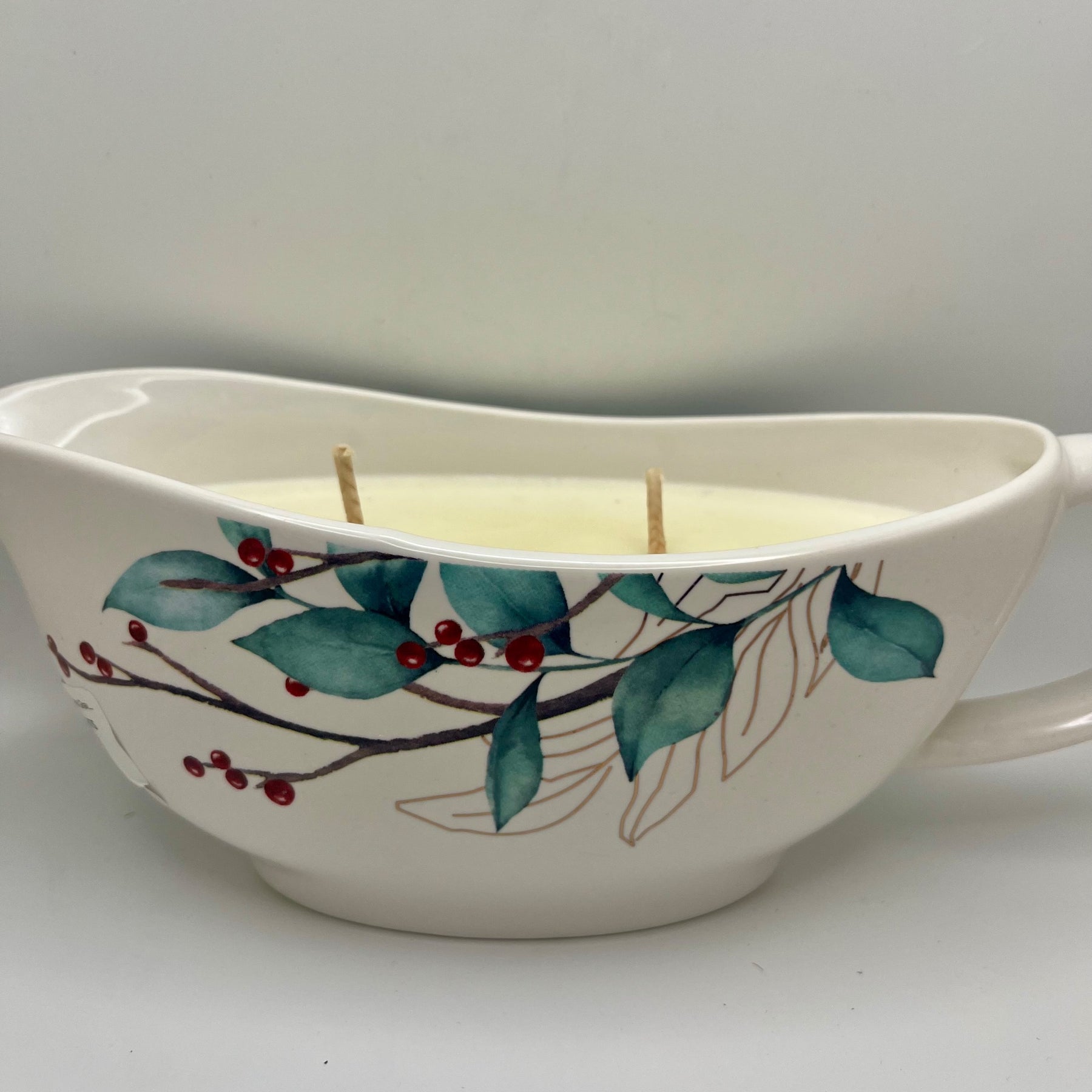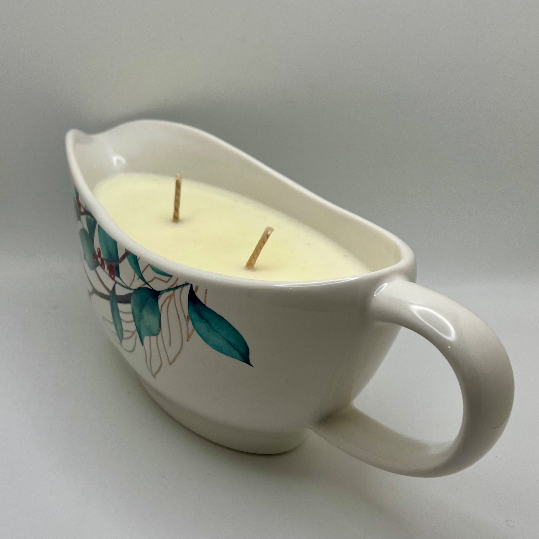 Holiday gravy boat upcycled into an Aspen winter & bonfire scented candle.