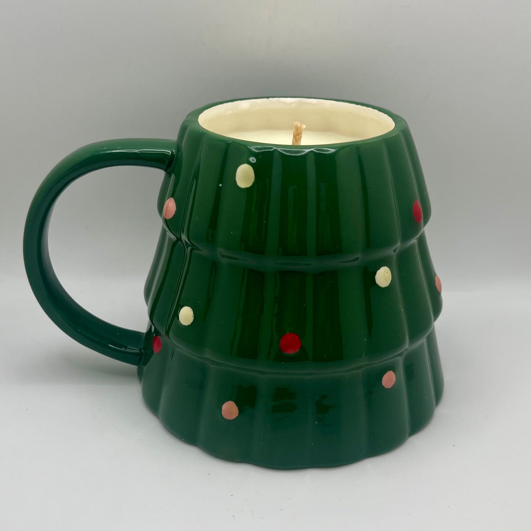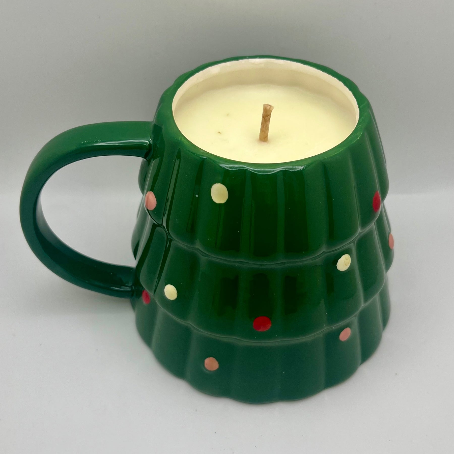 Christmas tree mug upcycled into a Christmas pine scented candle.