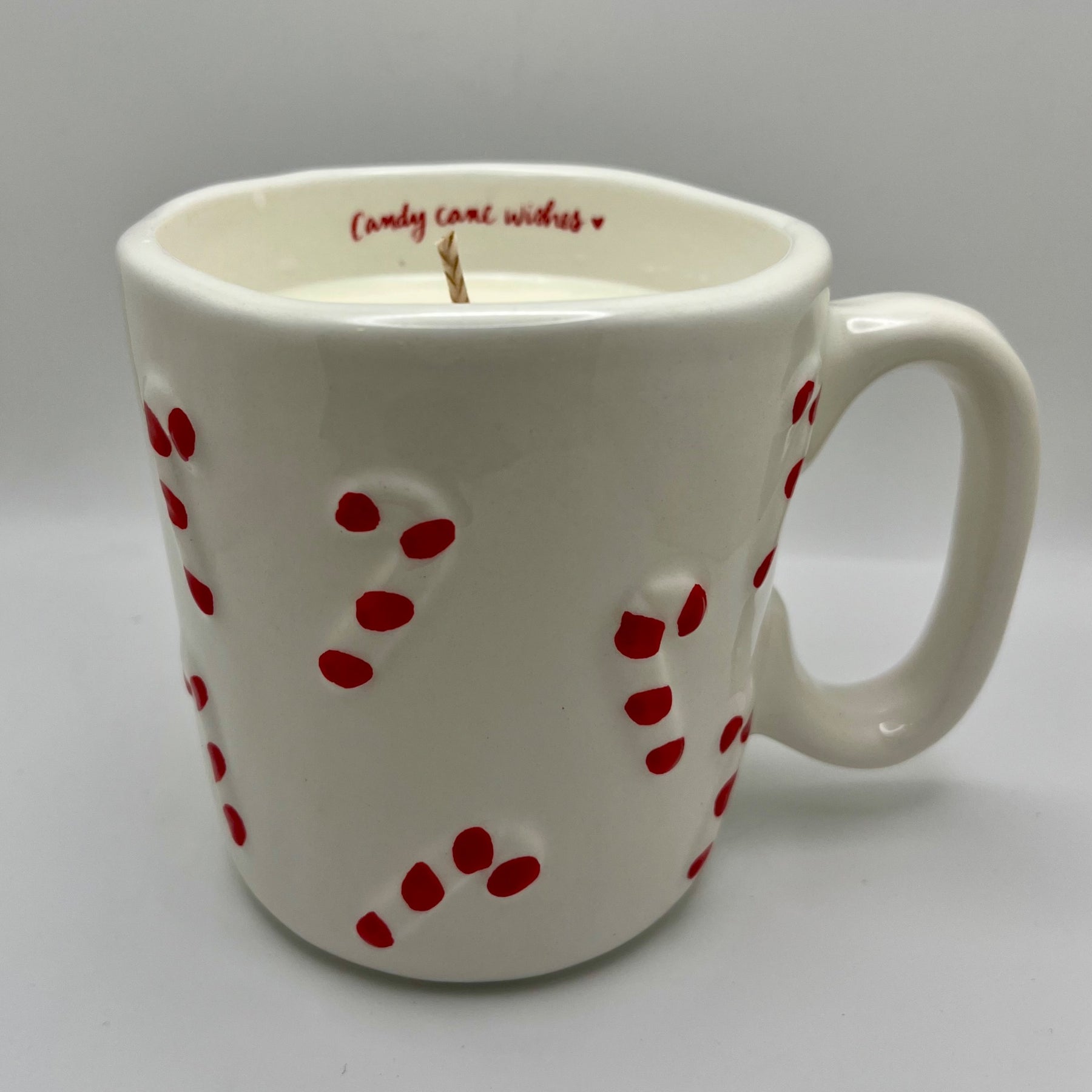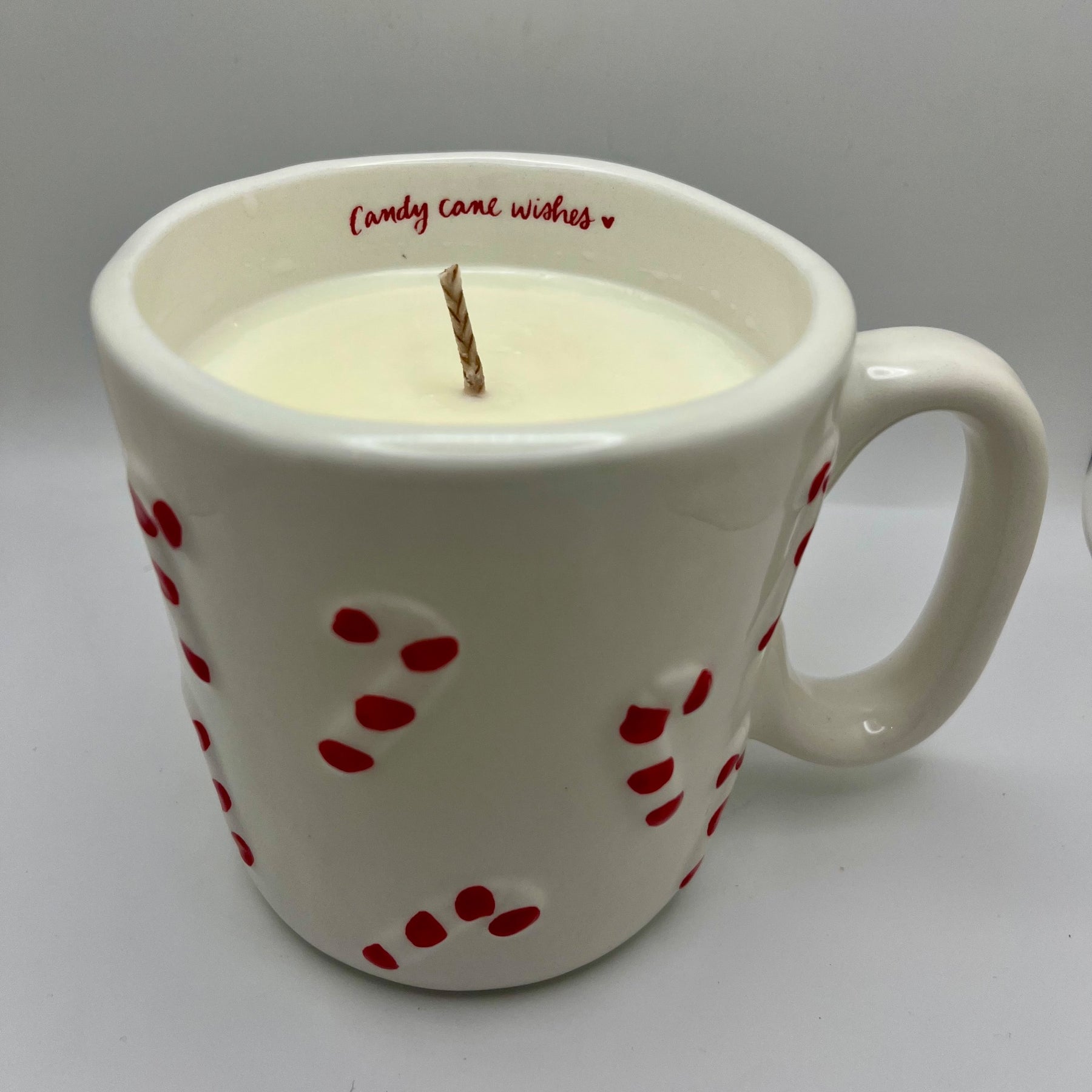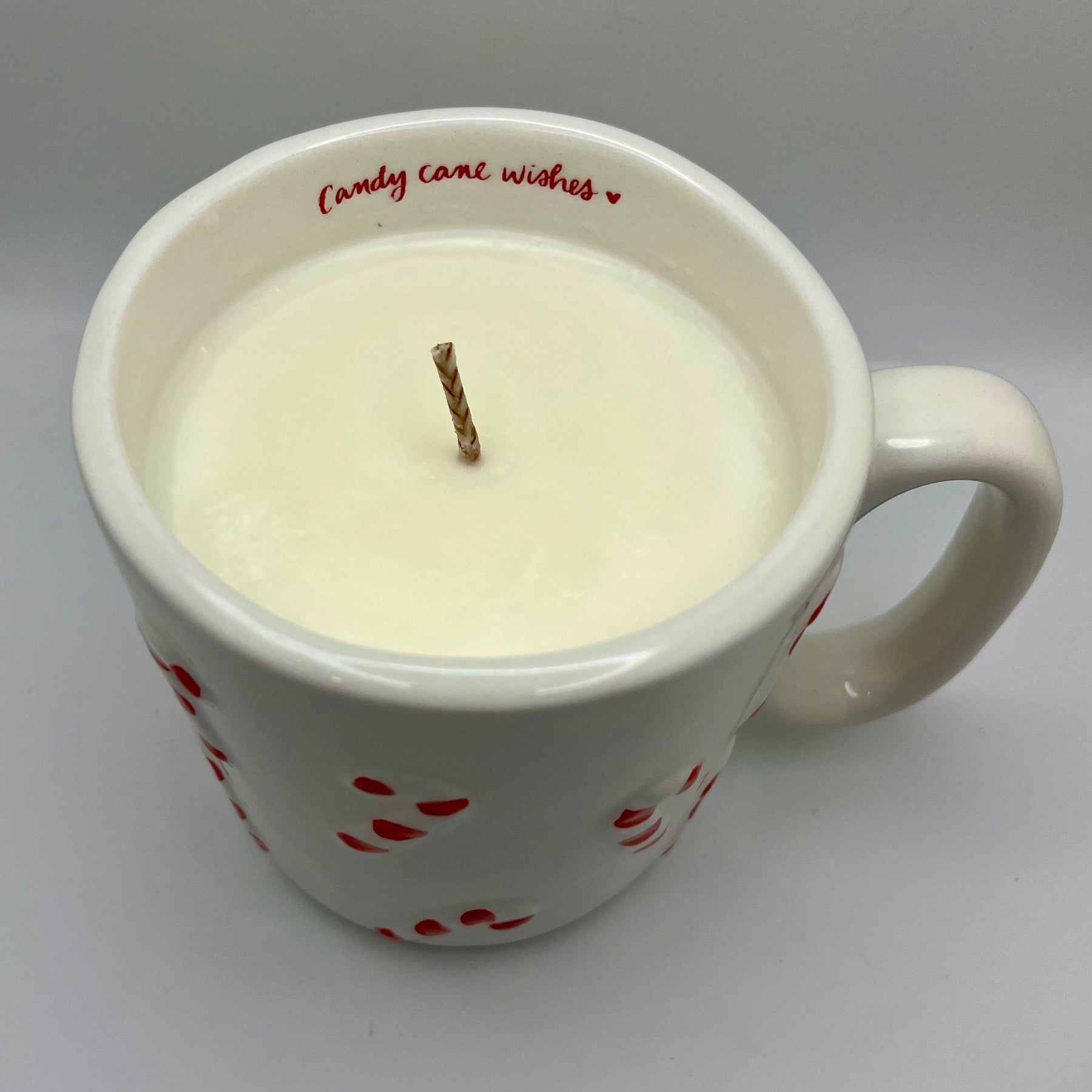 Candy cane mug upcycled into a peppermint scented candle.