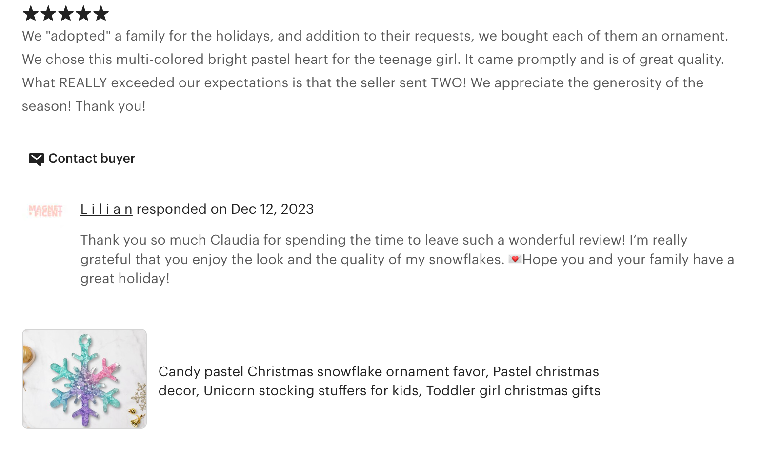 The holiday snowflakes ornament set in the pastel palette is the perfect add to unicorn or mermaid theme Christmas decoration. They are also what your customers are looking for kids stocking stuffers and advent calendar fillers for young girls! Your customers will love you by saving them time for searching the Christmas party gifts since the sparkly ornaments can surely bring joy to their guests as party favors. These are shatterproof, and you can be worry free about any loss during the shipment and display at your shop. The ornaments come with either silver or gold elastic strings depending on supplies availability. It’s guaranteed that the vibe will be similar to the pictures, but the colors may differ slightly depending on the batch. The patterns in the products you receive will DEFINITELY (yup!) look different from the pictures due to the unique effect created by the alcohol ink. These are handmade products, which by nature may have imperfections. Etsy customers highly rated them.